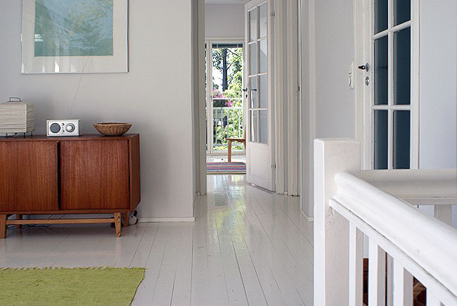 Koska uuteen osaan taloa tuli uudet lautalattiat, ei vanhojakaan oikein voinut jättää ennalleen. Olisi mennyt noin kuusikymmentä vuotta ennen kuin uusi lattia olisi ulkonäöllisesti sulautunut vanhaan. Enkä halunnut muutenkin melko sokkeloiseen ja yleisilmeeltään vähän sekavaan vanhaan taloomme monenlaisia lattioita. Siksipä tehtiin ratkaisu, että maalataan talon kaikki lattiat valkoisiksi, sekä uudet että vanhat.